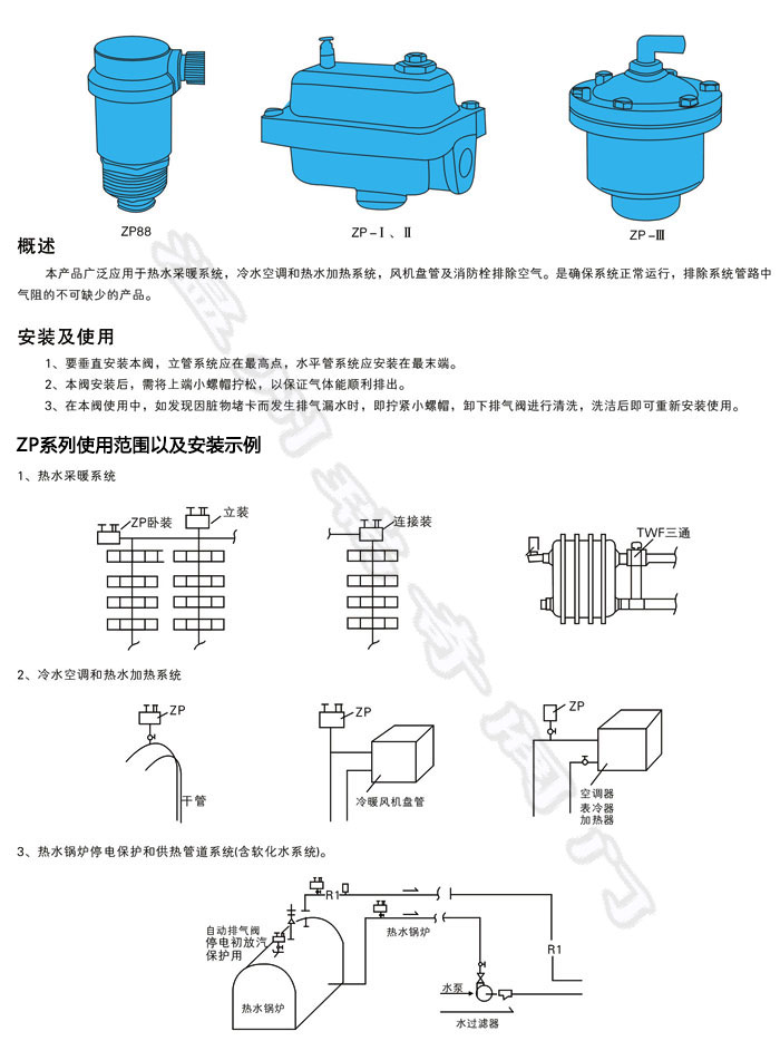 ZP-I、II方形臥式自動排氣閥廣泛應用于熱水采暖系統,冷水空調和熱水加熱系統,風機盤管及消防栓排除空氣。是確保系統正常運行,排除系統管路中氣阻的不可缺少的產品。